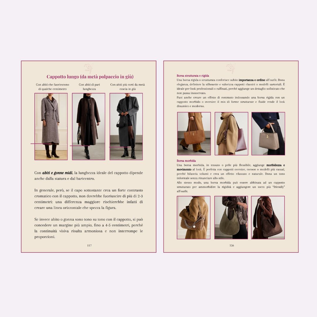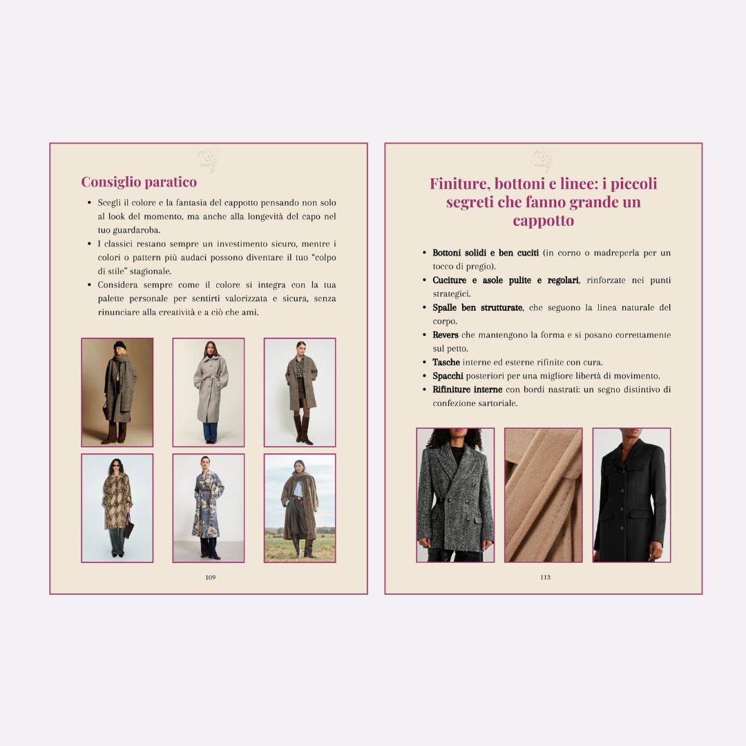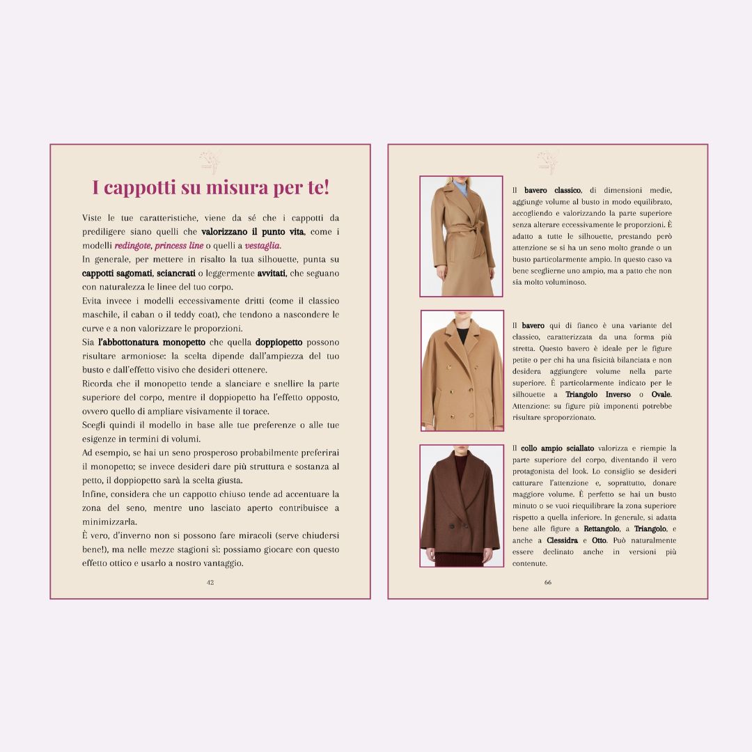 All'interno della guida troverai un’analisi dettagliata per ogni forma del corpo e per ciascuno degli otto stili principali. Per ognuno, scoprirai i cappotti ideali, con indicazioni su dettagli come bavero, tasche e linee, pensati per esaltare non solo le tue proporzioni, ma anche il tuo gusto personale. Prenderai decisioni di stile con sicurezza e consapevolezza, sapendo esattamente quali modelli sono più affini a te.